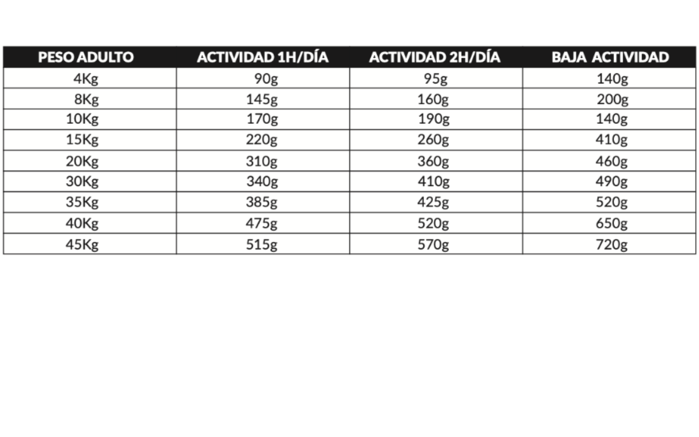 Estas cantidades son aproximadas y pueden variar en función de la edad, raza, carácter, nivel de actividad, clima y otros factores. Ajustar la ración para mantener al perro en su peso ideal. Como guía general, la ración diaria debe situarse entre el 1% y el 1,5% del peso corporal del perro.