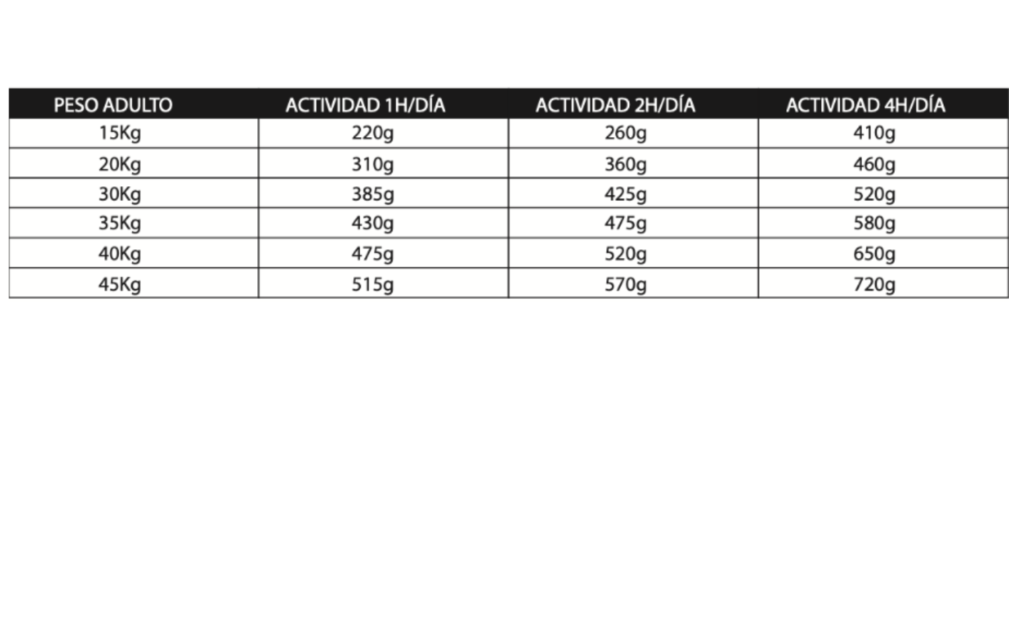 Servir el alimento en seco acompañado de agua limpia y fresca siempre disponible. Las cantidades de alimento pueden variar en función de la raza, edad, peso, nivel de actividad y condiciones ambientales. Puede administrarse en 2 o 3 tomas diarias según recomendación veterinaria.