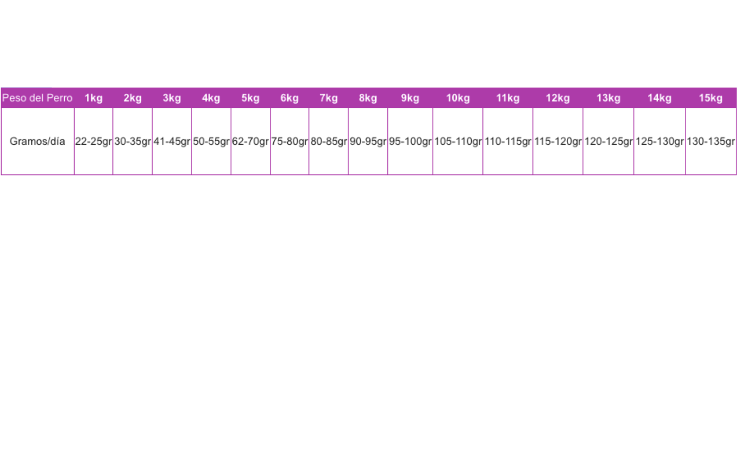 Las cantidades pueden variar según la edad, raza, nivel de actividad y entorno. Ajustar la ración diaria para mantener al animal en su peso ideal.